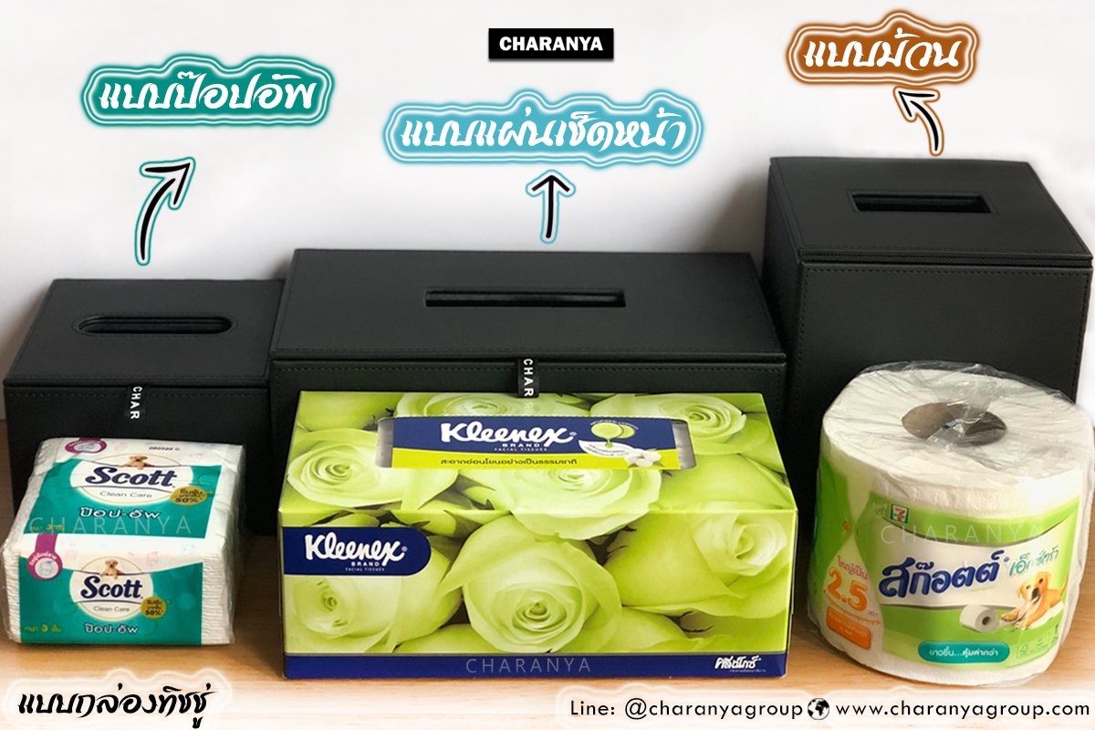 ปัจจุบันกล่องทิชชู่ผลิตออกมาให้เข้ากับทุกรูปแบบ ยกตัวอย่างแบรนด์ Charanya ที่ตัวกล่องโครงไม้หุ้มด้วยหนัง สามารถเปิดปิดได้ได้สะดวก ด้านในบุด้วยกำมะหยี่เนื้อดี ไม่ทำให้ทิชชู่ขยับเขยื้อนได้ บางรุ่นมีมีฐานรองกันน้ำให้สามารถวางได้ทุกพื้นที่ รุ่น CHRTIS_S ขนาดเหมาะกับทิชชู่แบบม้วนรุ่น สำหรับเอาไว้ในห้องน้ำ เป็นต้น CHRTIS_P ขนาดเล็กจะเหมาะกับทิชชู่แบบป๊อปอัพ ส่วนขนาดใหญ่จะเหมาะกับทิชชูแบบแผ่นดึงเช็ดหน้า ผลลัพธ์ดี พาให้ดูหรูหราแบบนี้เห็นทีคงต้องรีบหาซื้อกล่องมาใส่ทิชชู่แล้วล่ะ